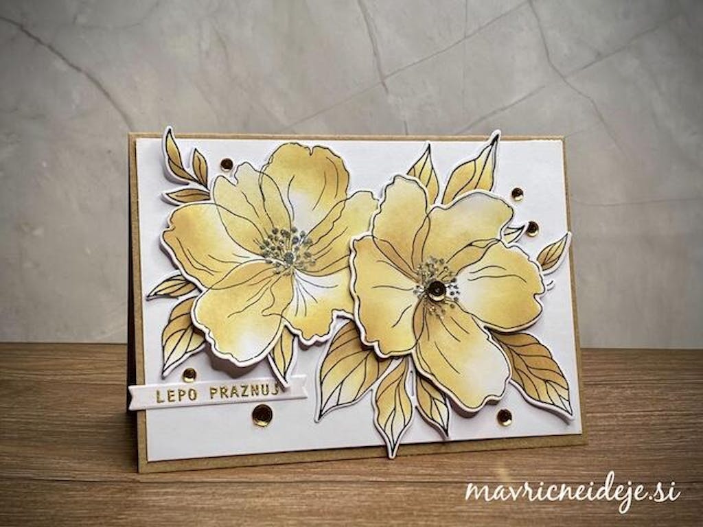 I used stamps, cutting dies, and plastic stencils for colouring to make a monochromatic card with large yellow flowers.