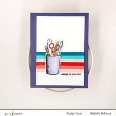 The 2" x 3" Crafting Essentials Stamp Set features an adorable, unique stamp set that contains an image featuring a pail full of crafting materials, including two pencils, a pen, a pair of scissors, and a ruler. The accompanying sentiment, "always do your best," provides the perfect amount of motivation to get through studies, work, or other tasks.