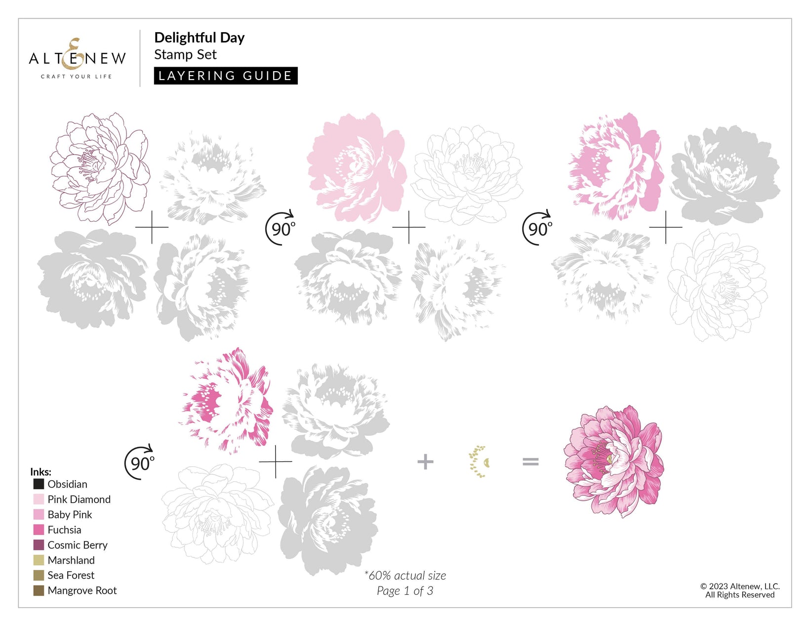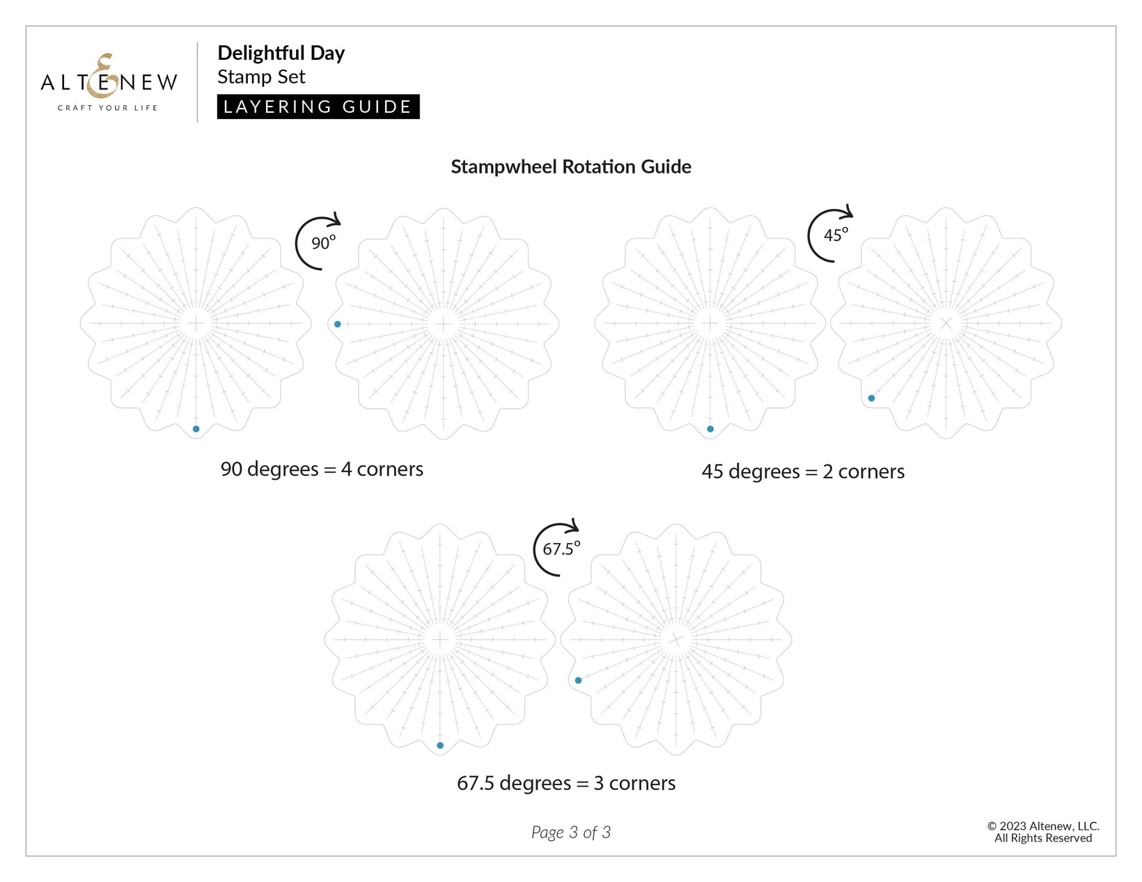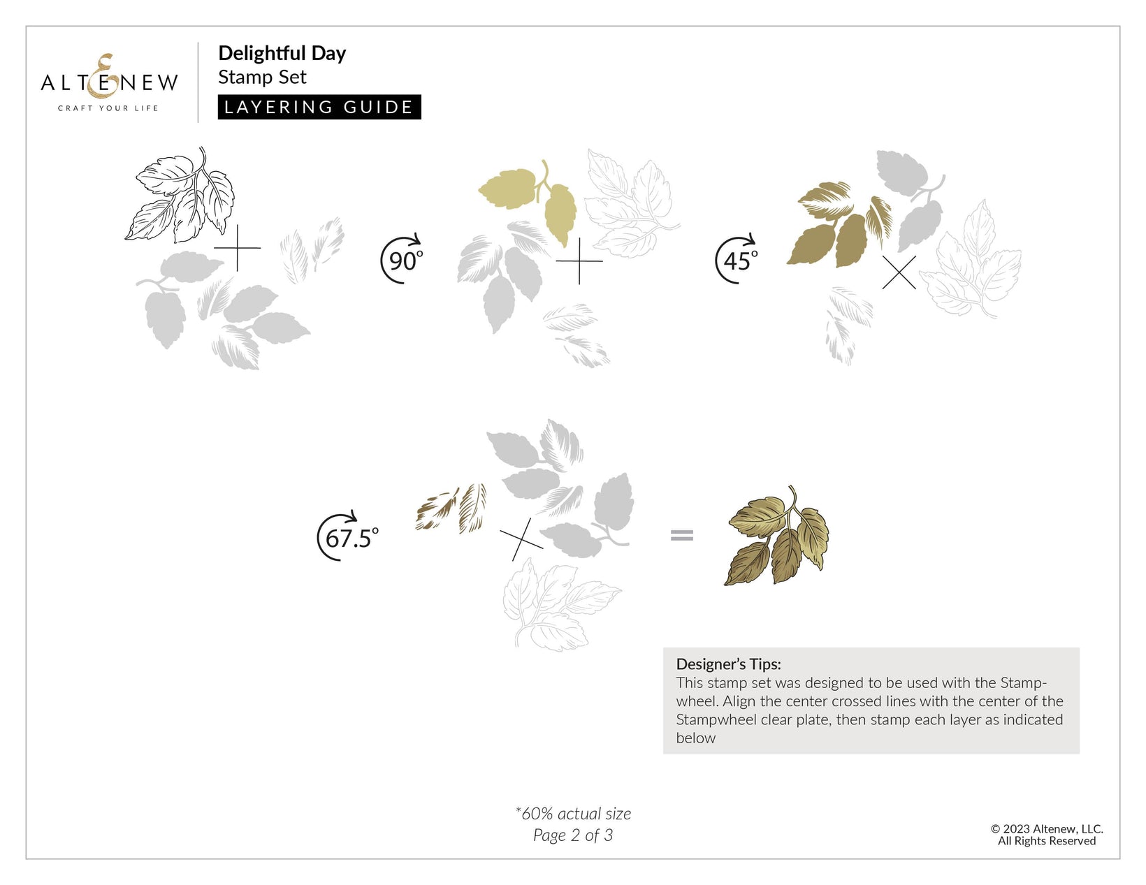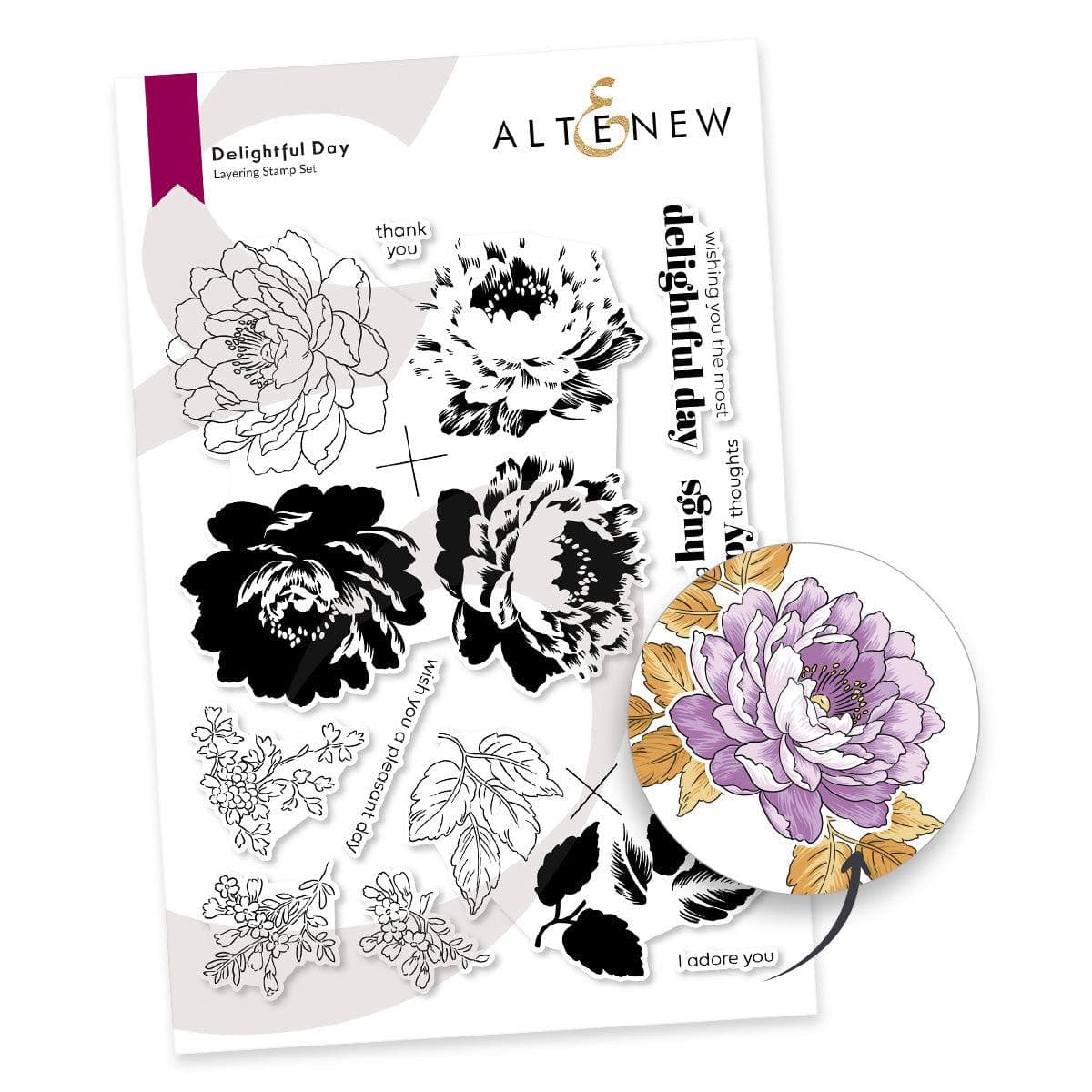 Back by popular demand, but this time with a clever twist, the 6" x 8" Delightful Day Stamp Set includes a layering flower and leaf branch that will work best with the aid of the Stampwheel. Simply align the cross with the center of your Stampwheel and rotate it 90 degrees for each layer. This set also includes four complementary sentiments along with three outline images, perfect for completing your flower arrangements!