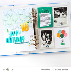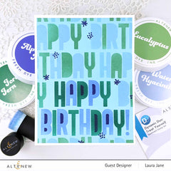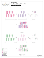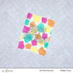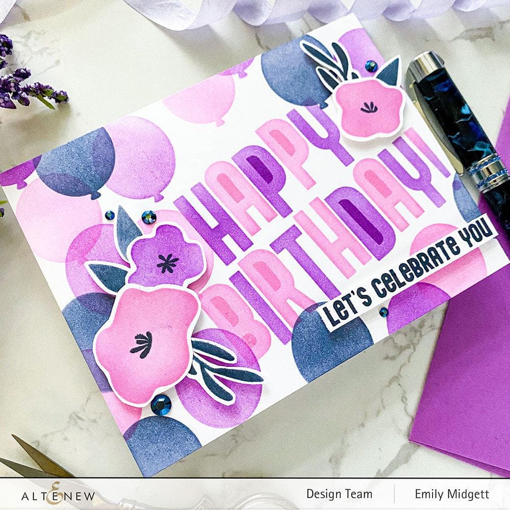 Use the clever stencil set to create a fun Happy Birthday sentiment accented by modern flowers or balloons. Then, use the stamp set to complete your project by adding details to the letters, centers to the flowers, and sentiments!