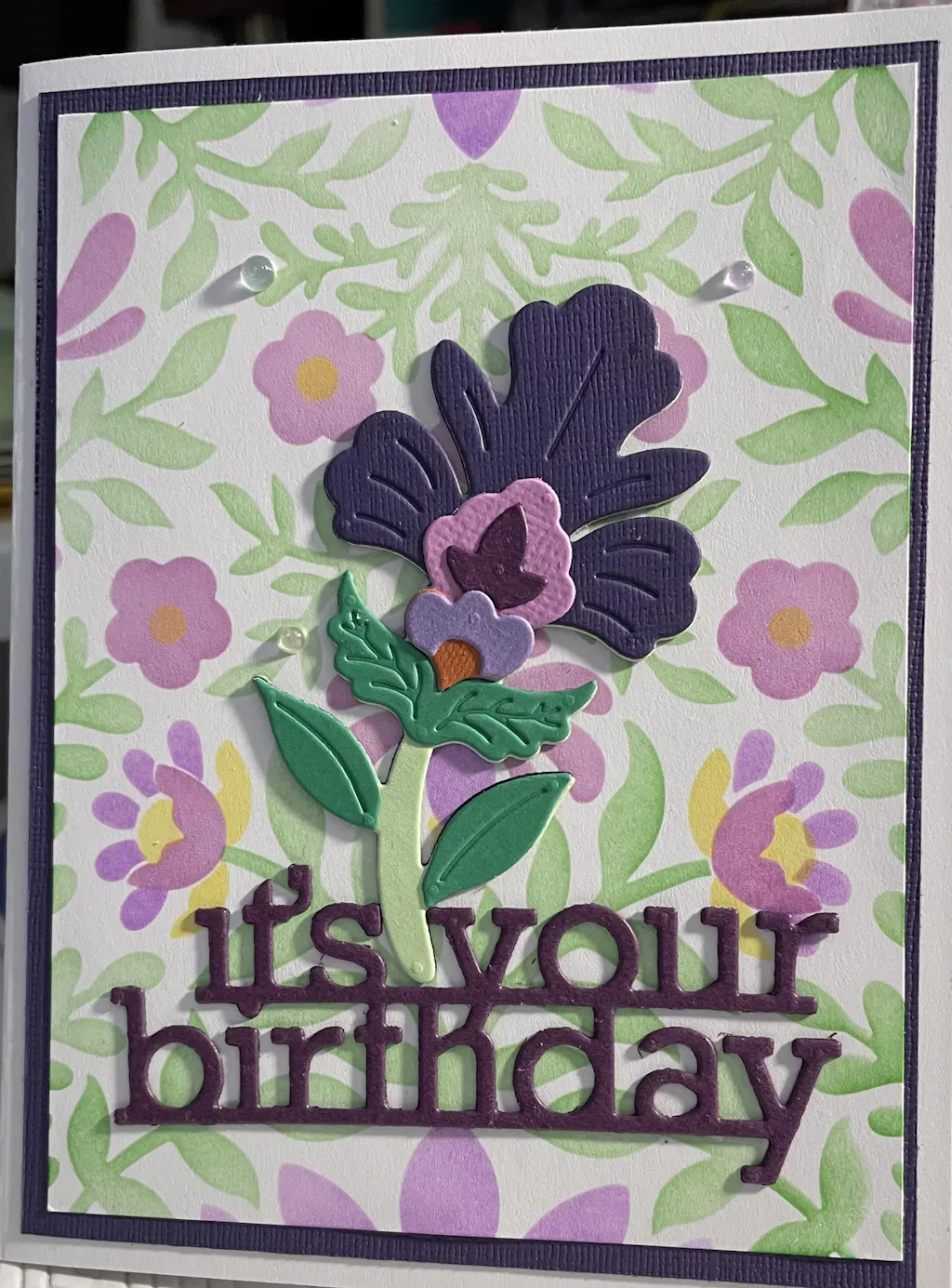 ▪ Create a floral background using multiple die-cuts from the Embellished Flora Die Set. Adhere them around the corners of the card front. Then, add a white-embossed sentiment on a black cardstock strip to complete the design.