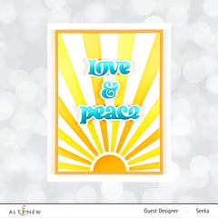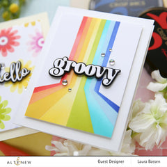 Die Dimensions: groovy: 2.7" x 0.8" ▪ far out: 2.4" x 0.8" ▪ peace: 2.1" x 0.6" ▪ &: 0.6" x 0.6" ▪ love: 1.5" x 0.6" (each sentiment also has a shadow die that cuts a .05" border around the outer edge)