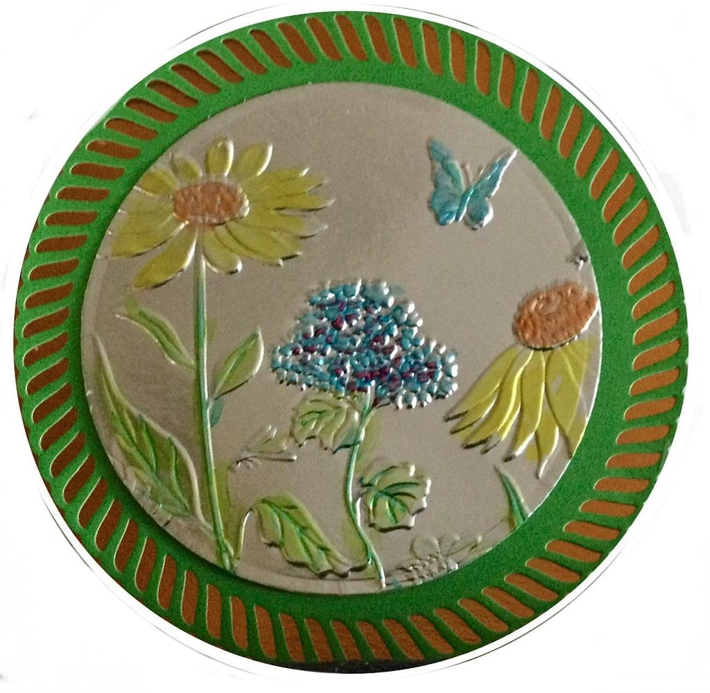 This is one of my all time favorites! I get a kick out of the ‘trash to treasure’ hacks so I used the inside foil seal of my favorite Talenti desert jars to emboss most my my many Altenew embossing folders. I colored with markers & made medallions! Fun!