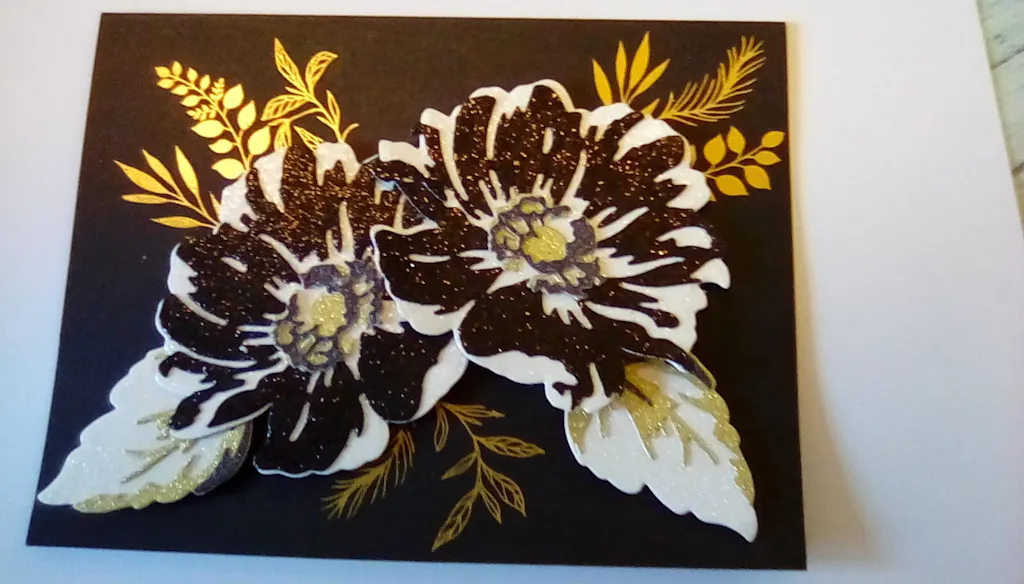 I keep coming back to use this set as it creates stunning results! Used recently for a 50th wedding anniversary card, also used to decorate the card box and the seating chart board. This time used with glitter card stock and had some flowers left over so I created some extra cards on black. Can't say enough about this set!
