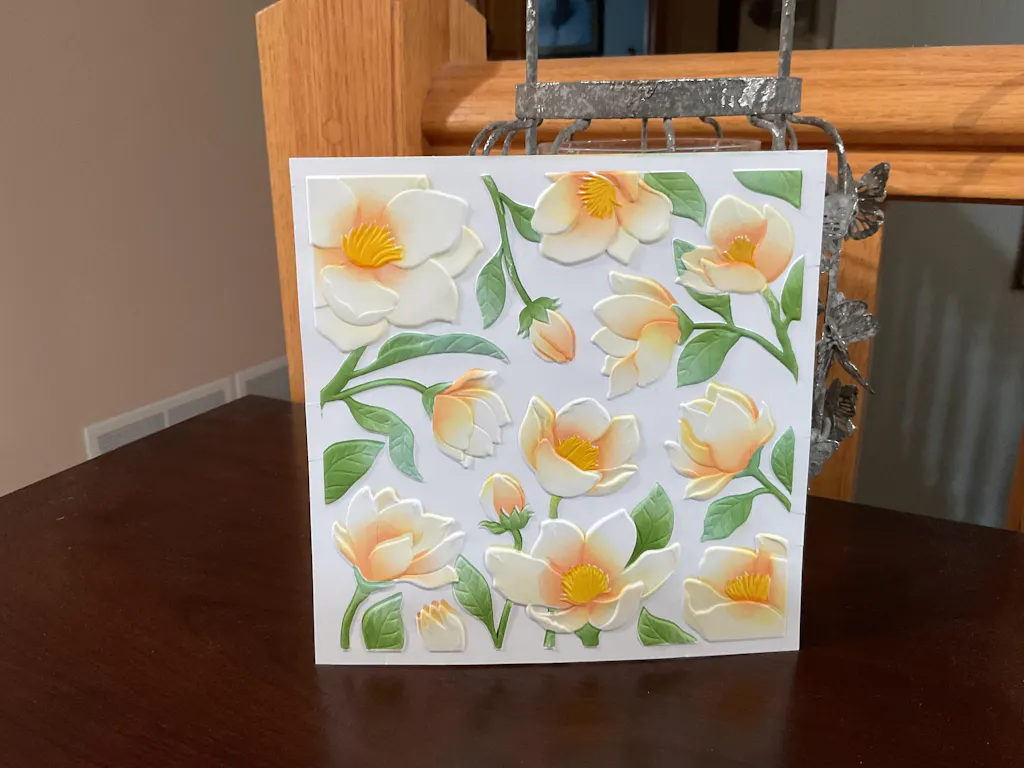 Craft a breathtaking floral scene with the 6" x 6" Magnolia Dreams 3D Embossing Folder! Featuring a gorgeous arrangement of 12 magnolias, delicate buds, and branches, this embossing folder beautifully covers an entire card front with elegant blooms.