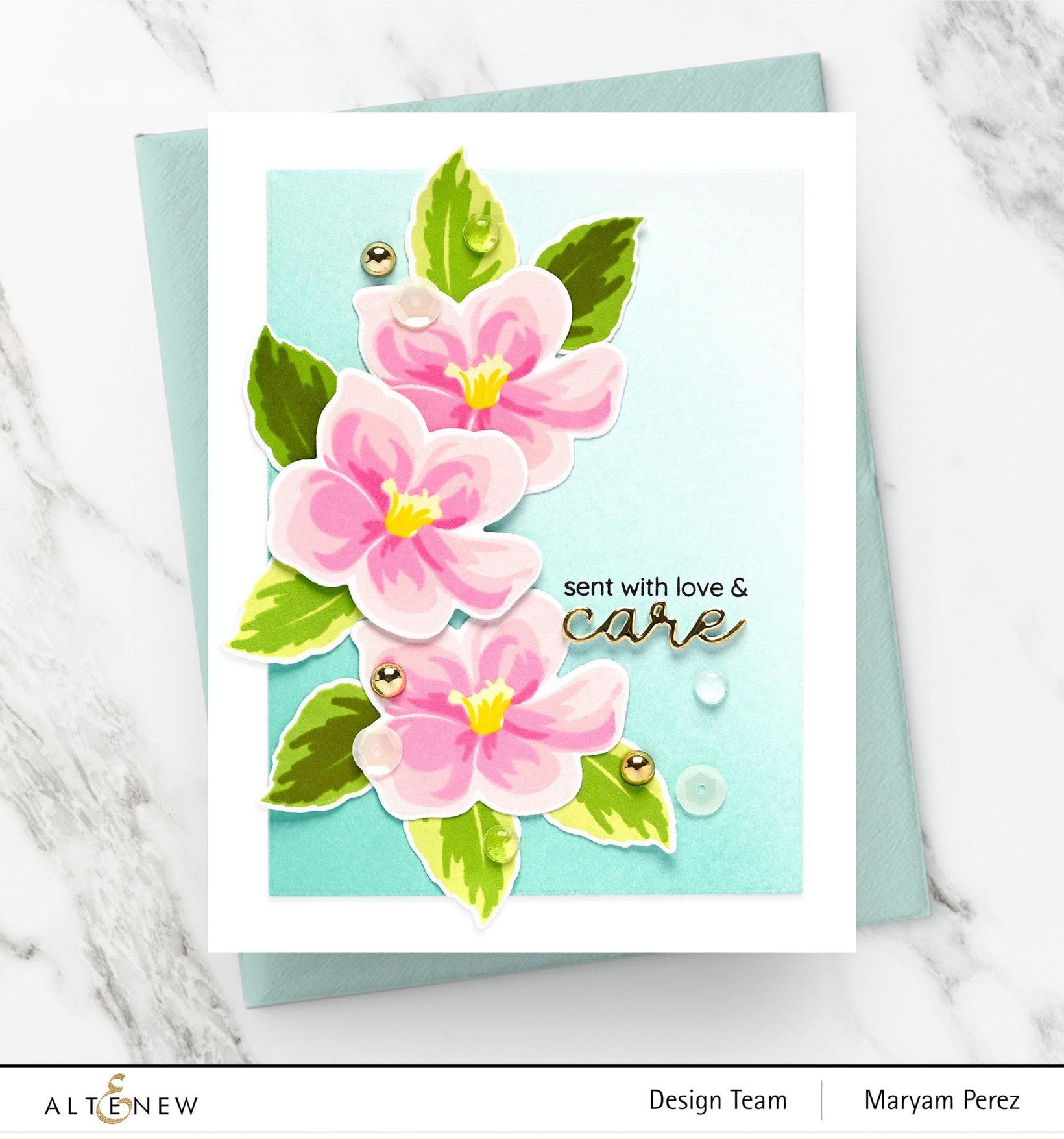 Designer's Tips: Create a wreath! Stamp and die cut the blossom and leaves multiple times, and arrange in a circle on your project. Use the center of the wreath to stamp your sentiment, along with the die-cut "care" from the set! This is made even easier with the use of our Stampwheel.