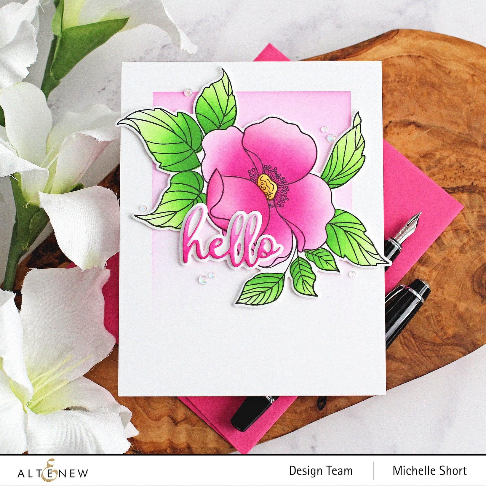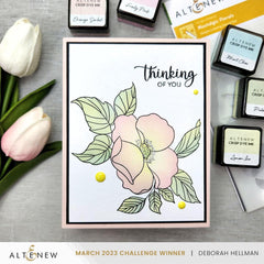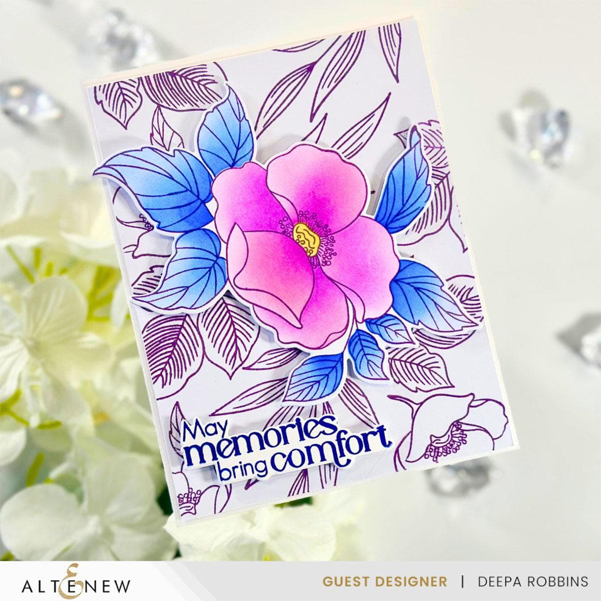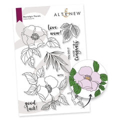 Introducing Altenew's Nostalgic Florals products, the stamp Set showcases the Rosa Woodsii in three different arrangements. Also included are a couple of leaves and branches that may be combined with the given arrangements, or with any other florals in your stash. The eight complementary heartwarming sentiments are perfect to complete your project!