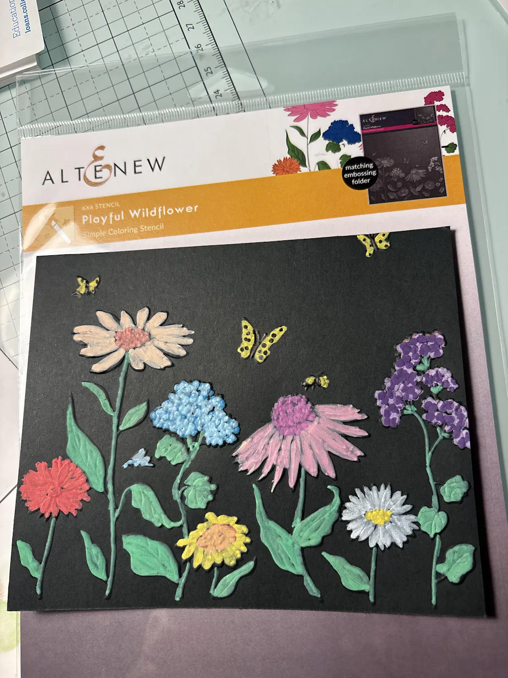 I used the stencil, embossing folder and acrylic paint pens. I really like the way this design looks on black and the acrylic paint pens make the flowers pop!