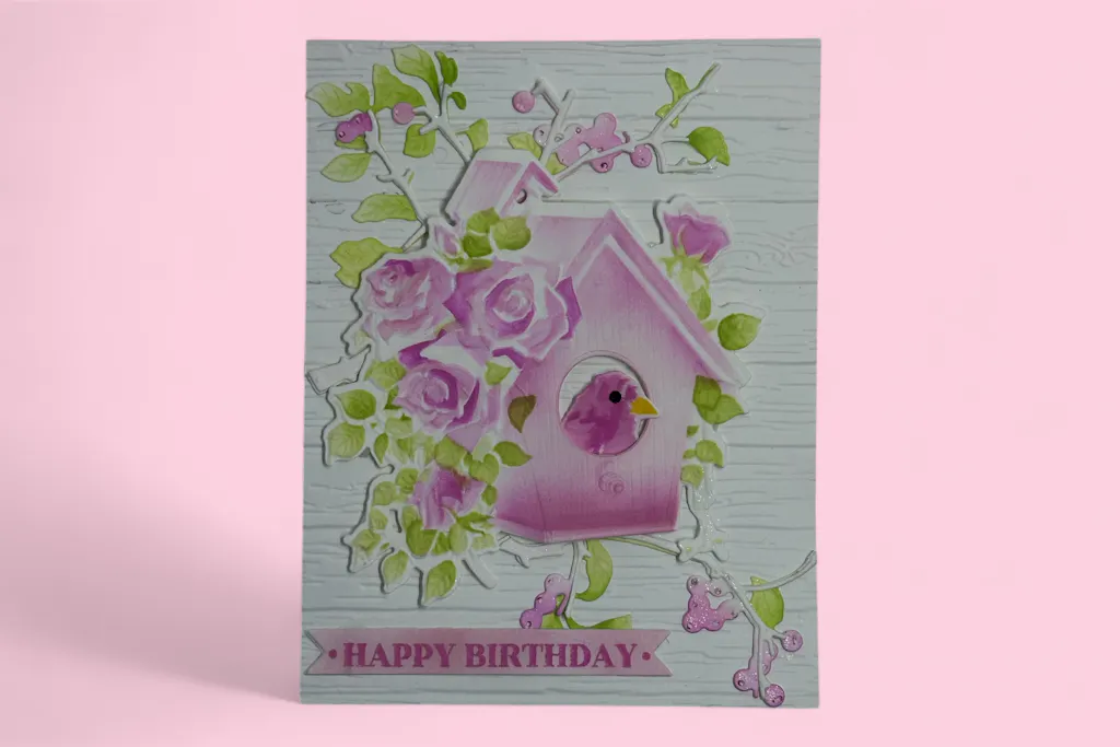 The 6" x 6" Rose Garden Birdhouse 3D Embossing Folder showcases a charming wooden birdhouse surrounded by beautiful roses, perfect for creating quick, enchanting handmade cards, scrapbook and journal pages, or DIY home decor projects.
