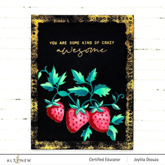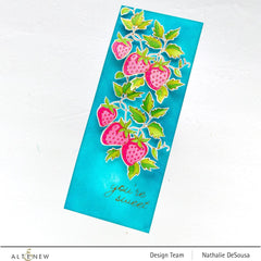 Designer's Tips: If you are ink blending the image without using the hot foil plate, then the etched guides on each stencil are here for you! Start by inking the base of the strawberries (A1), then line up the guides on each element with them for perfect placement.