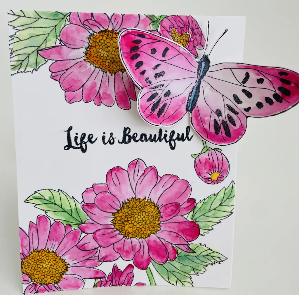 This stamp set is so easy to use and can achieve great results for beautiful compositions , color schemes , and dimensions ! I made a card mimicking my Fall Garden with daisies blooming and pretty butterflies! I look forward to playing this set more in the future!